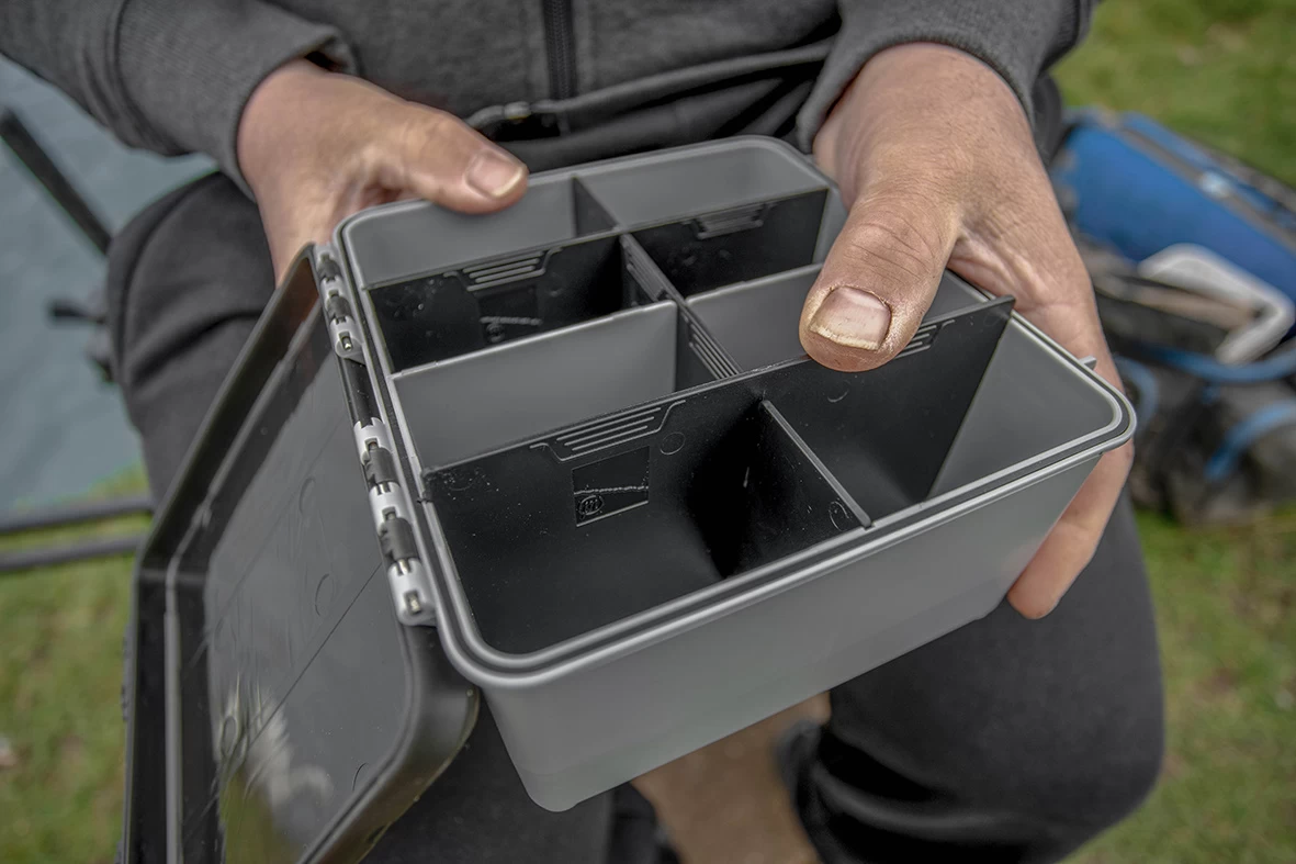 Ideaal om een breed scala aan accessoires veilig en secuur op te bergen. Het kan daarbij gaan om, bijvoorbeeld, delicate pellet wagglers, dobbers voor de vaste hengel maar ook voerkorven; window feeders kunnen hierin rechtop staand opgeborgen worden. De Hardcase Accessory Box wordt afgesloten met twee sluitingen, deze helpen – in combinatie met de TPE pakking – om de inhoud van de doos droog te houden. De verplaatsbare verdelers maken het mogelijk om de doos op diverse manieren in te delen, vanaf twee grote vakken tot en met acht kleinere vakken; perfect voor het opslaan van voerkorven in diverse maten.
